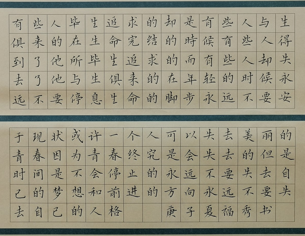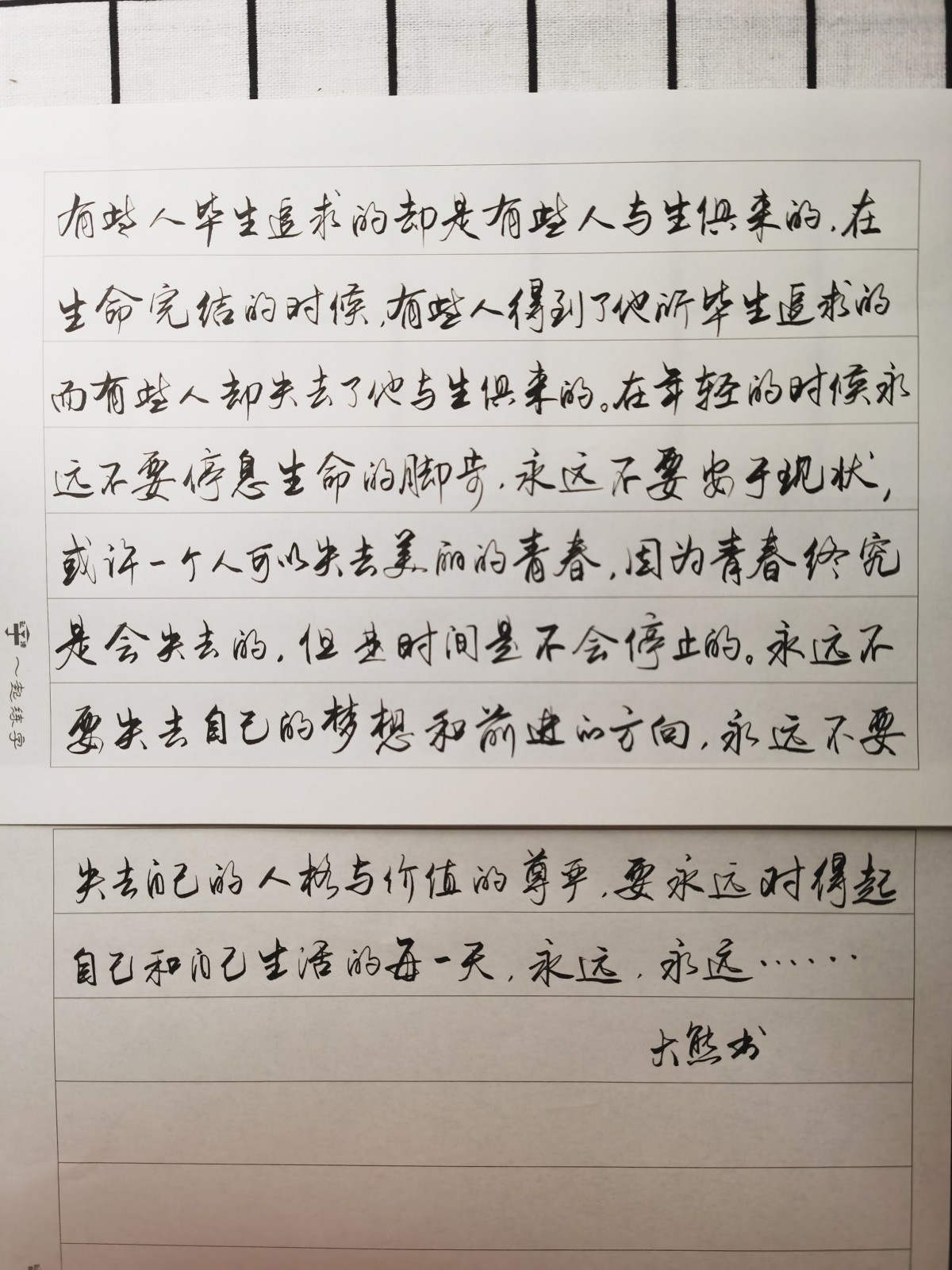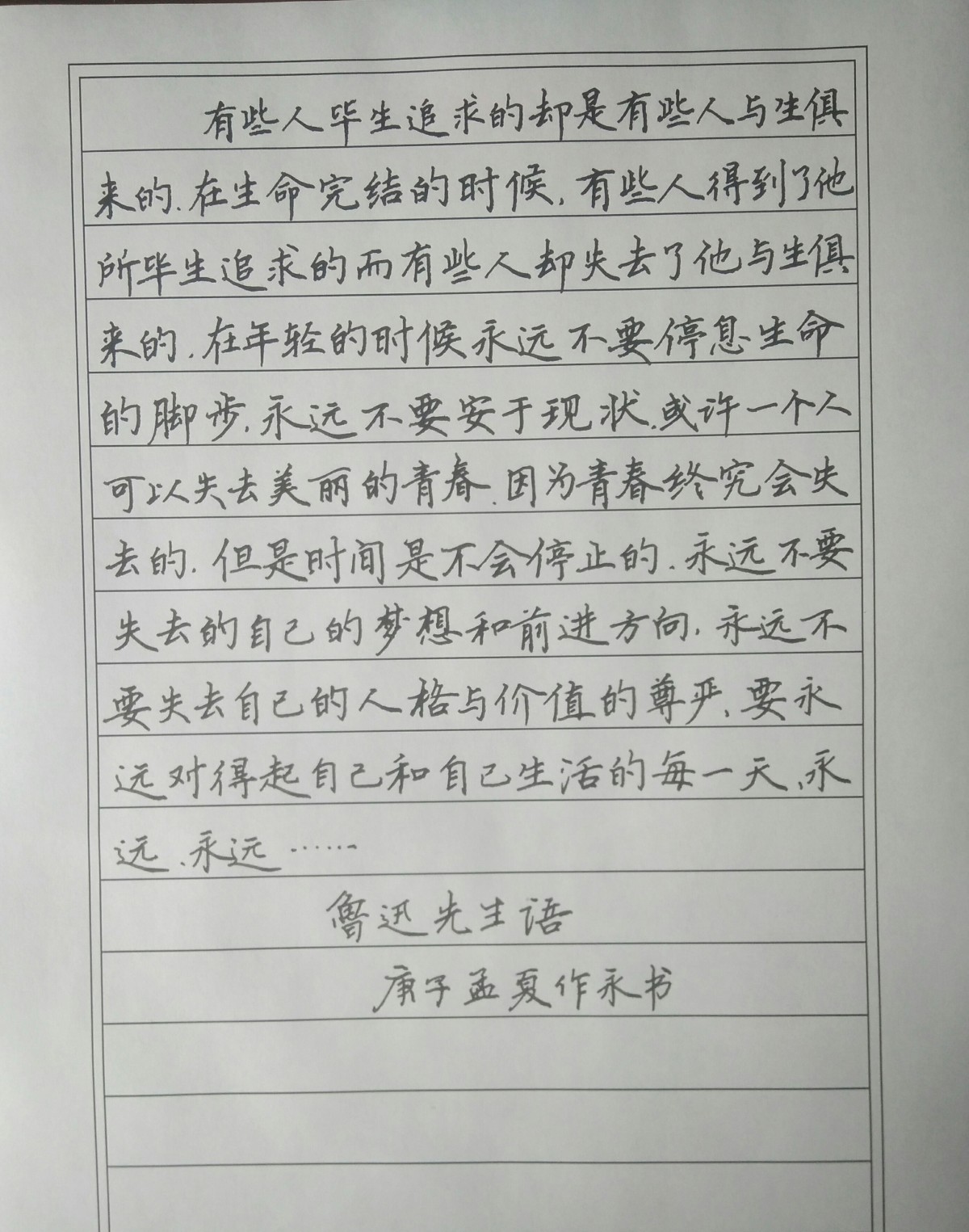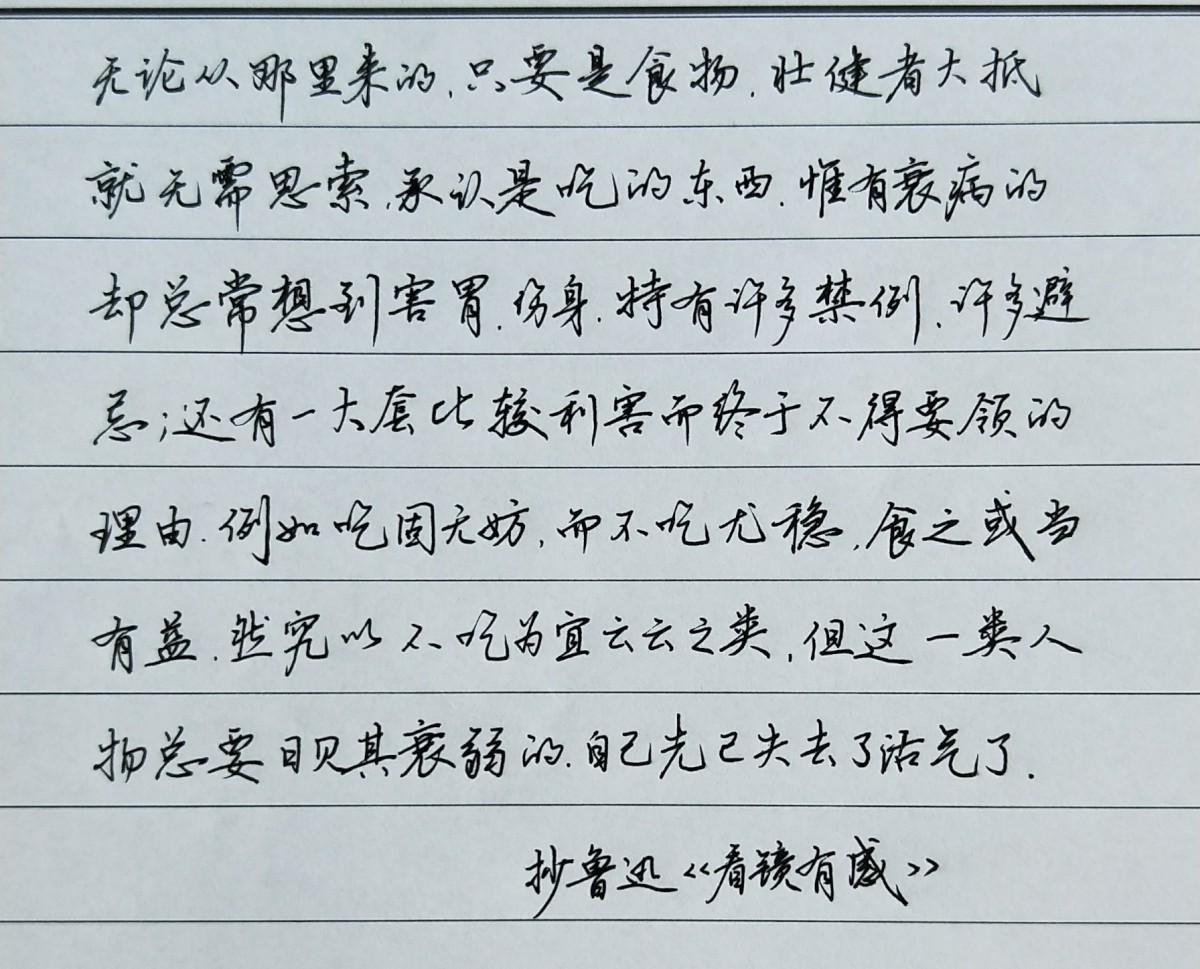 上期的钢笔字练习的题目,是抄写鲁迅先生的一段文字,字数都不少,有一个附加要求