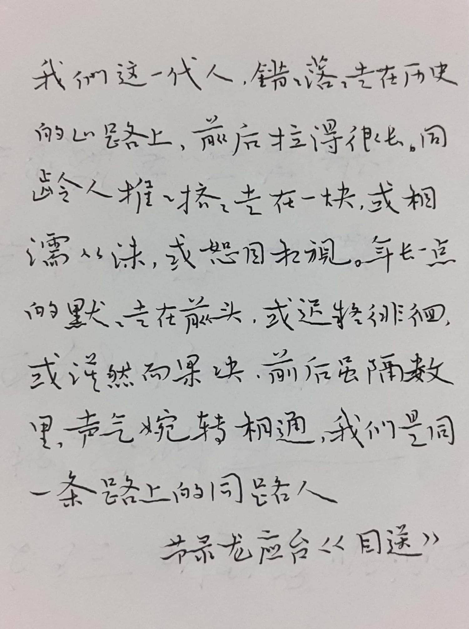 时间变得真快,如果在早几年,龙应台还是一帮小资文青追逐的对象,现在却成了大家讨伐征战的一个出口。我在布置这个题目的时候,远远没有想到这三个字,能造成那么大的关注,以至于我在头条更新了一张我自己抄写的这段文字,下面的评论一堆高潮,确确实实没有想到的…