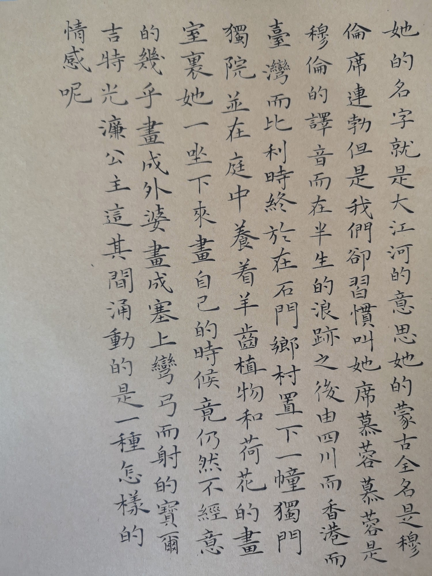 她的名字就是”大江河”的意思,她的蒙古全名是穆伦·席连勃,但是,我们却习惯叫她席慕蓉,慕蓉是穆伦的译音。 而在半生的浪迹之后,由四川而香港而台湾而比利时,终于在石门乡村置下一幢独门独院,并在庭中养着羊齿植物和荷花的画室里,她一坐下来画自己的时候,竟仍然不经意的几乎画成外婆,画成塞上弯弓而射的宝尔吉特光濂公主,这其间,涌动的是一种怎样的情感呢?
