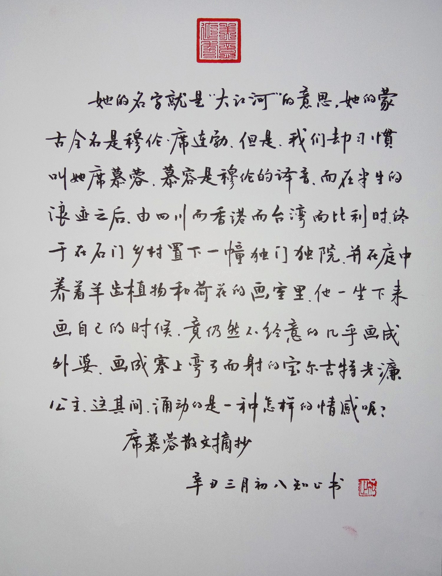 这副作业,一看就是有功底的,但是,感觉书写的状态,不够自然,不顺畅,有一种每写一个字都在想这个字该怎么写的感觉。席慕容有错别字,另外就是整篇下来,字形不够舒展,比如倒数第二行,后半句,不睁大眼睛都认不出字了。