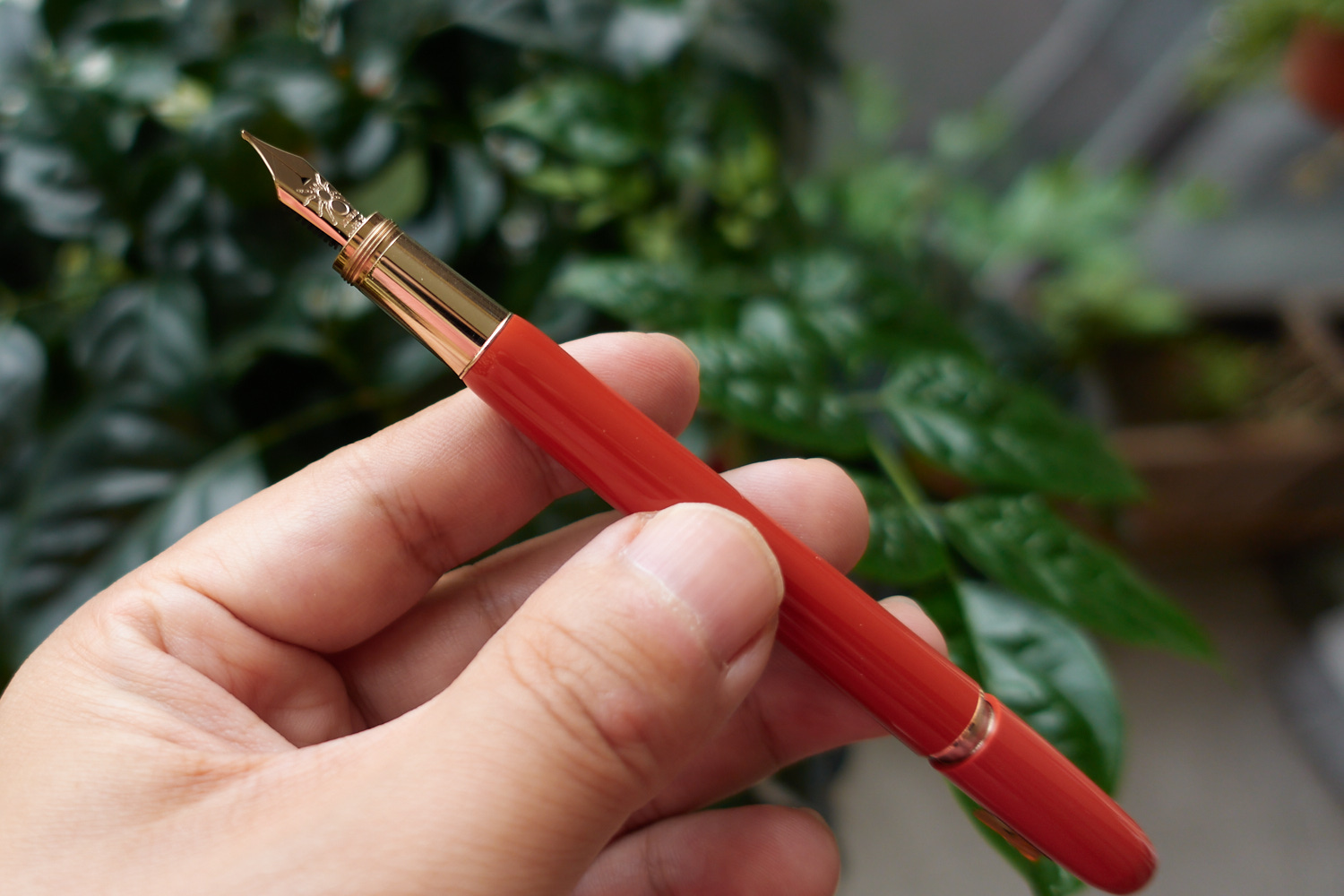 拿到手里的重量,明显是一支金属笔,但是外部漆面的质感,简直就像高级树脂一样温润。就类似你拿着一支全新的派克大橙豆的那种感觉,但是又多了一些分量。