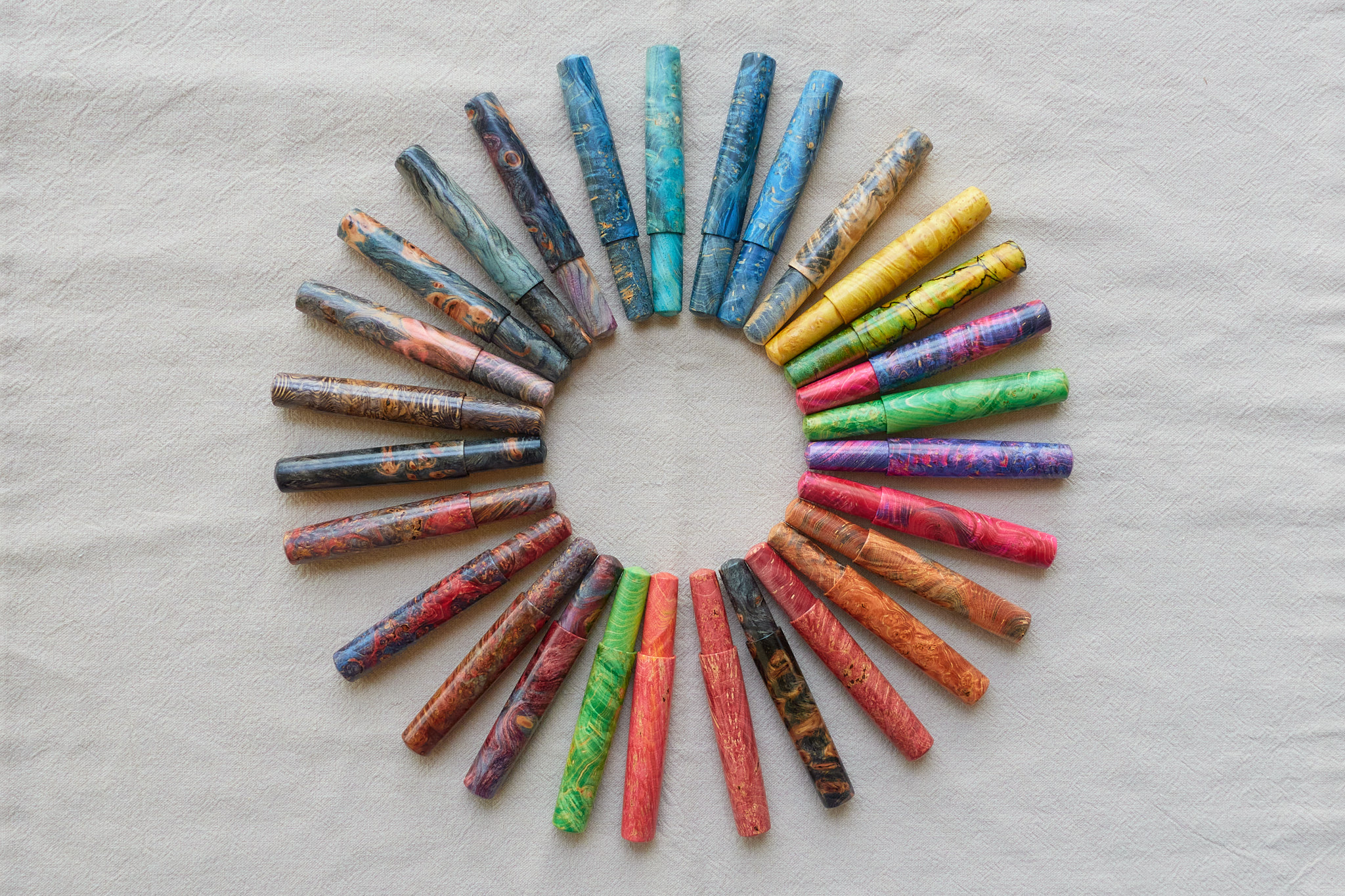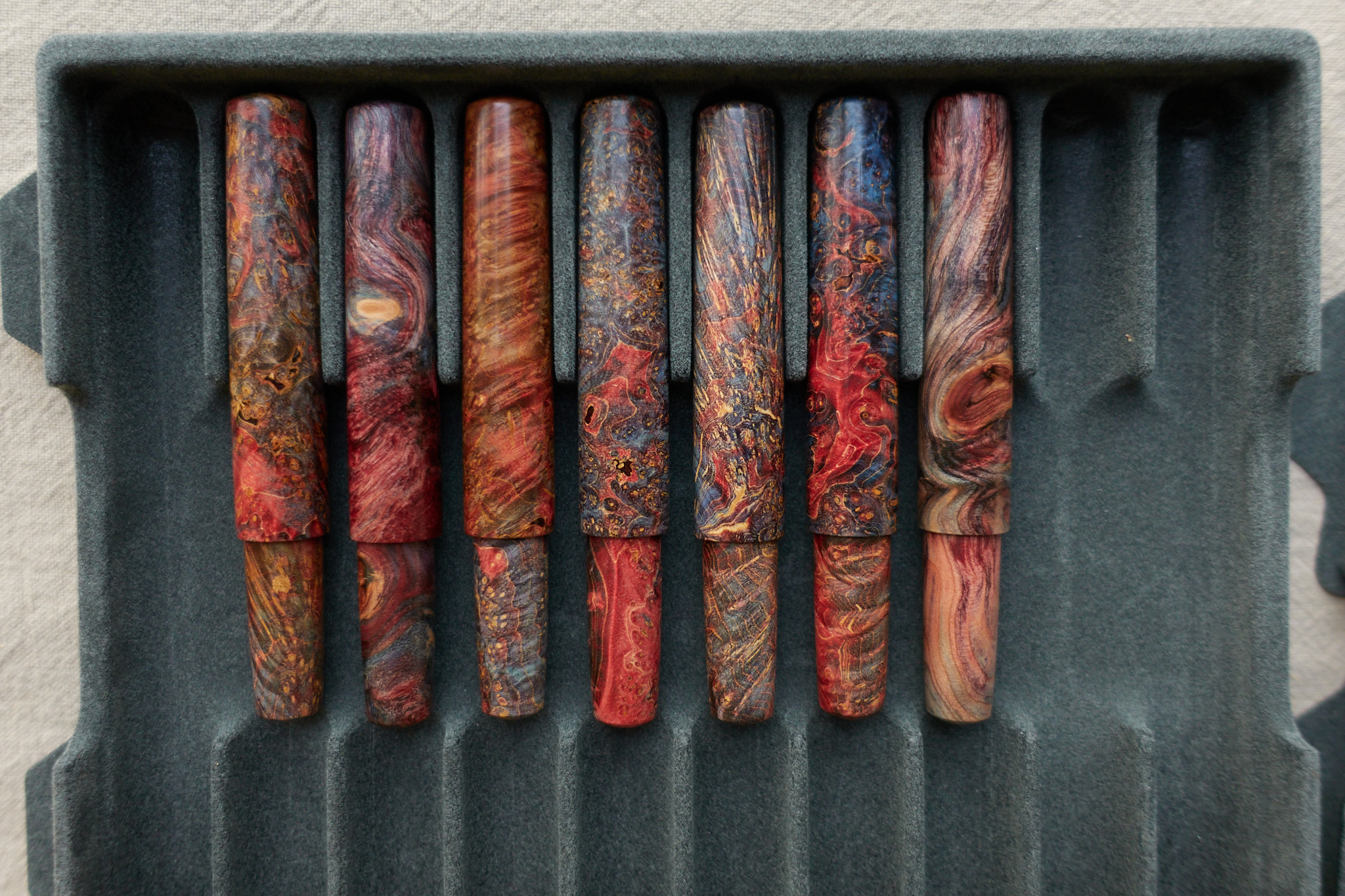 因为在第一批推出的时候,不少朋友对色彩绚烂的稳化木材质比较感兴趣,所以这次我们也多做了一批稳化木的钢笔,当然也还有纯木杆的钢笔。