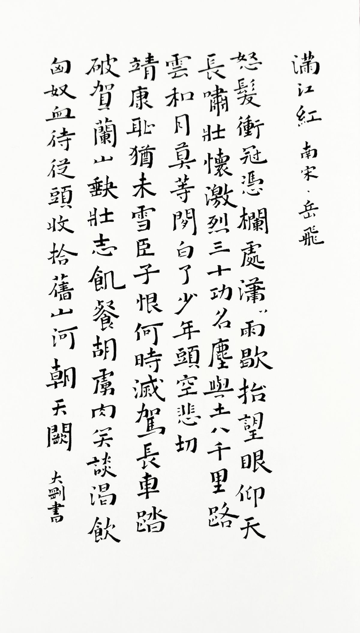 怒髮衝冠,憑欄處,潚潚雨歇。 抬望眼,仰天長嘯,壯懷激烈。 三十功名塵與土,八千里路雲和月。 莫等閒,白了少年頭,空悲切。