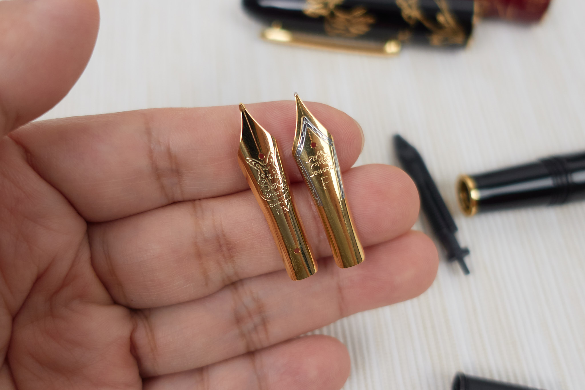 这两支笔,红色的这支是针对日常使用的EF笔尖,黑色那支是弘刃的长刀打磨的M尖。