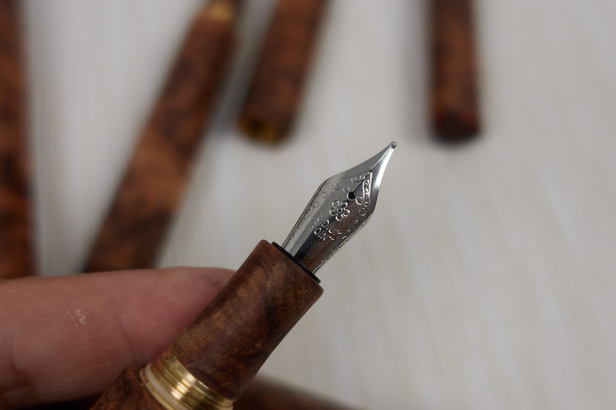 这两支黑白檀搭配的笔尖是Bock的5号笔尖,大家可以看这两支黑白檀的螺纹在笔握前端,那几支崖柏的螺纹在后面。
