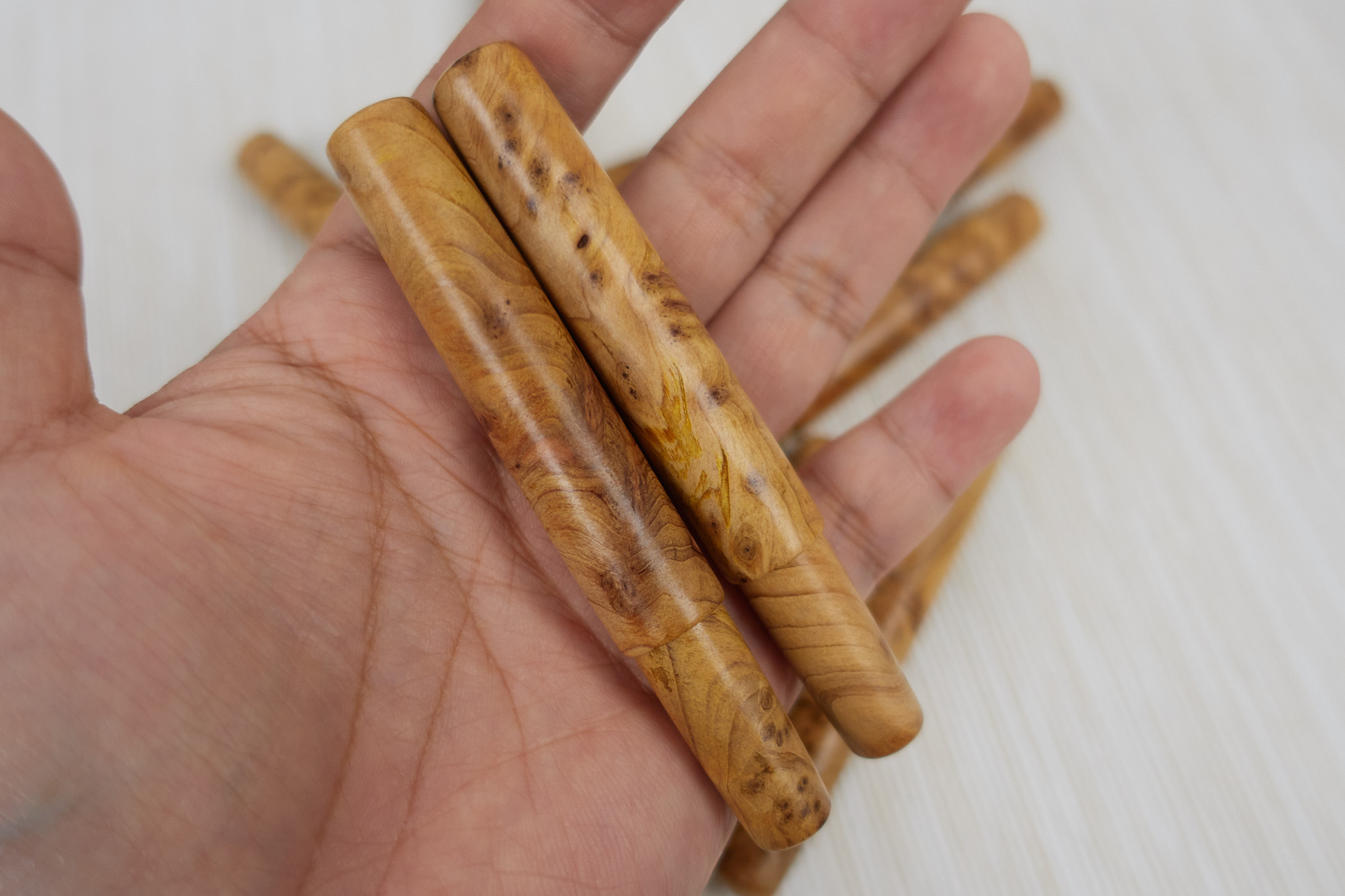 虽然是稳化木,尽量选的还是瘤料。整个质感还是不错的,我们的每一支稳化木的钢笔,都没有做过多的打磨,抛光的目数不算特别高,有兴趣的同学,拿到笔之后,可以自行找一些目数更高的砂纸,做进一步的打磨抛光, 或者上一层木蜡油,笔身可能会亮,更偷。