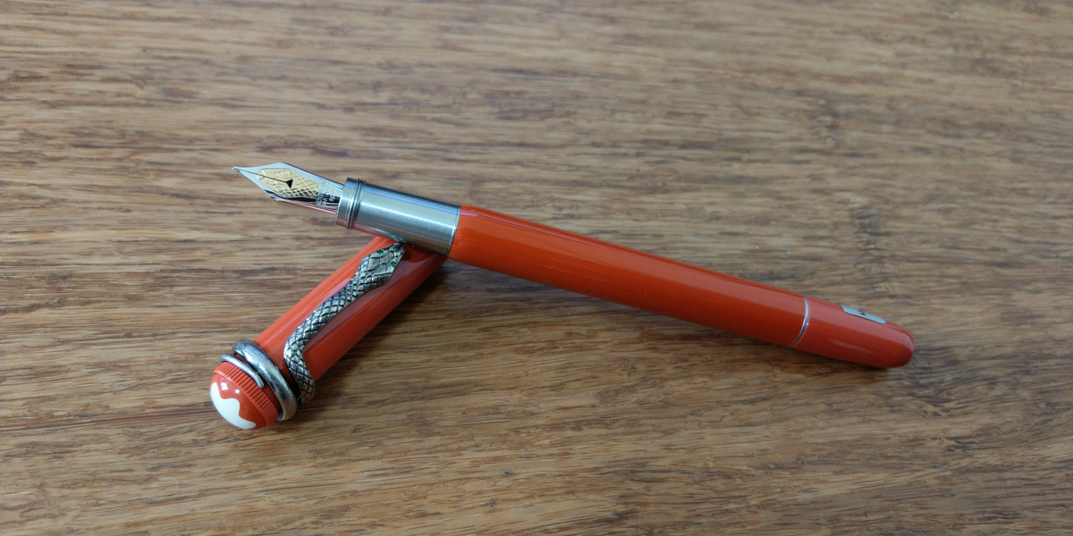 以万宝龙的黑蛇、红蛇、棕蛇为例,除了颜色不同,黑蛇的两颗蛇眼睛不知道镶嵌的是啥材料(毕竟官方也没提),红蛇笔帽的蛇眼睛镶嵌的是绿色尖晶石,而棕蛇的两颗眼睛镶嵌的是石榴石。这三款钢笔的笔尖都是采用的14K的镀铑金尖,不过黑蛇的笔尖全银,棕蛇笔尖全金(棕),只有红蛇采用的是双色尖,所以呢,很多朋友都对红蛇情有独钟。