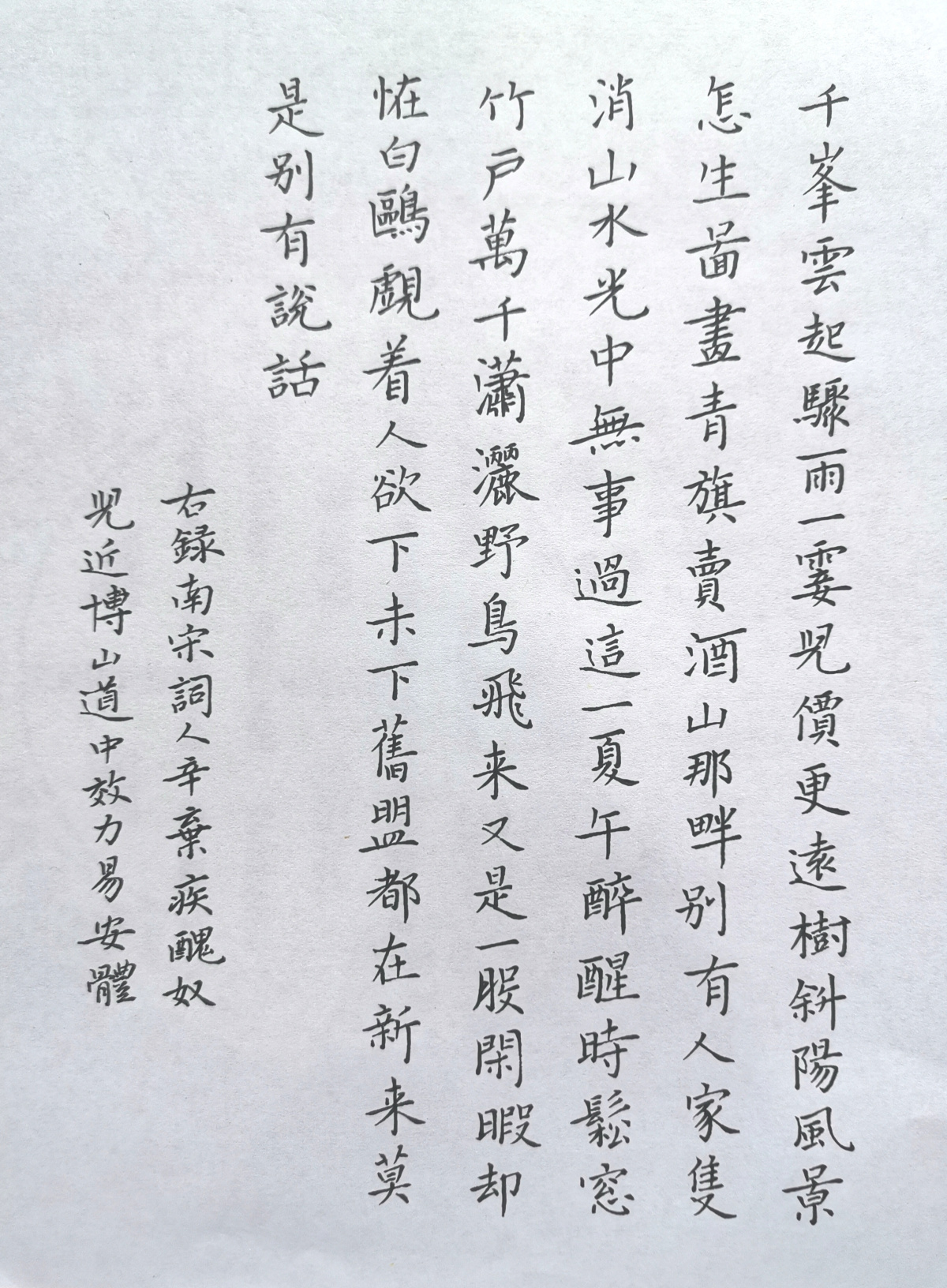 上一期的每周一篇钢笔字练习的题目是,辛弃疾的《丑奴儿近·博山道中效力易安体》。