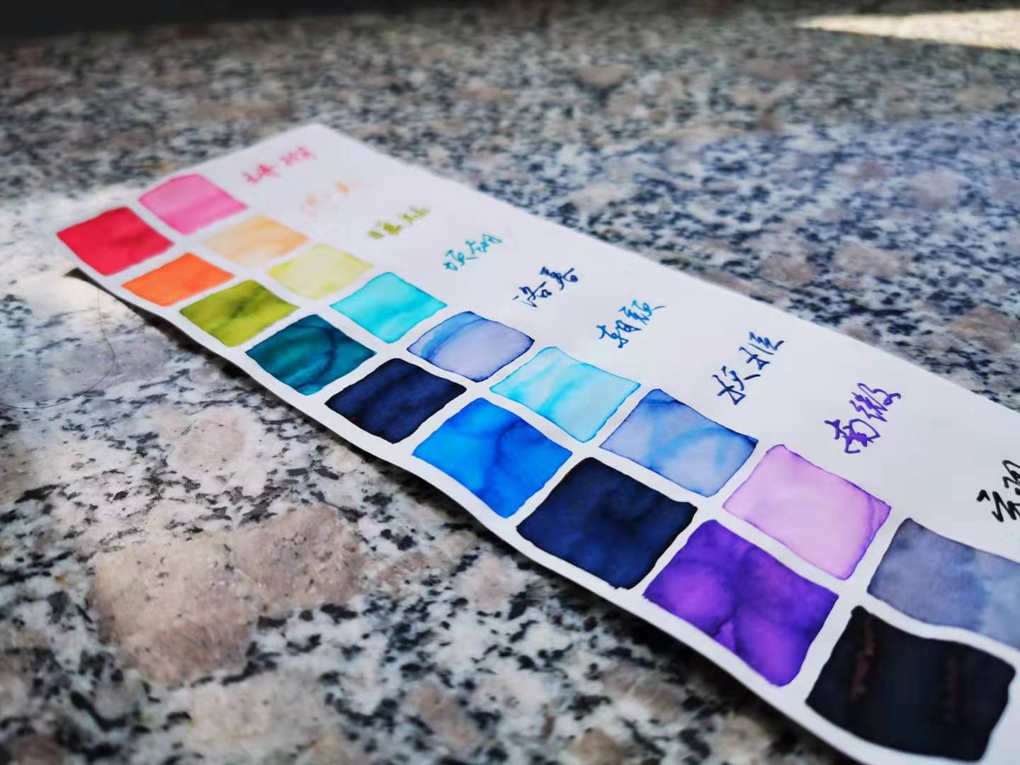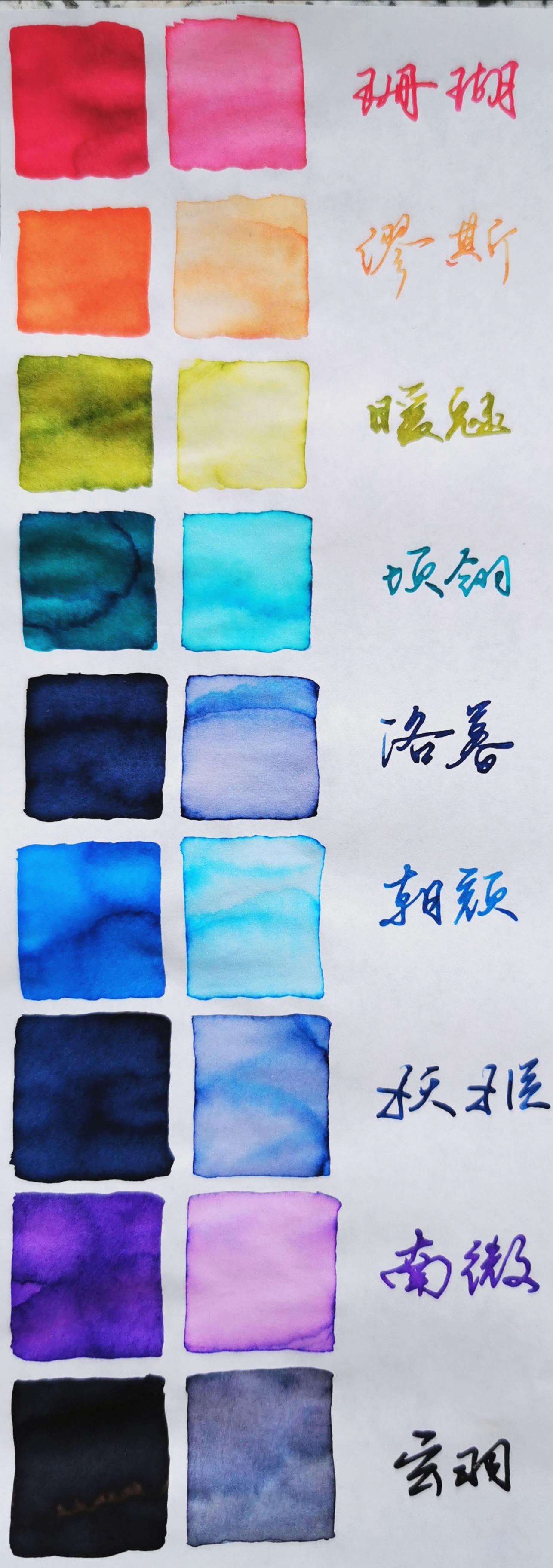 这一套彩墨一共有九个颜色,包装为玻璃瓶,均为18ml,小瓶子很可爱,名字都取的比较古风,不过也很迷,我不太清楚名字的意思和名字与颜色之间的关系。颜色里蓝色系比较多,饱和度都比较高,和标签上的颜色都有出入。墨水整体质地较稀,除了玄羽之外都没有sheen,部分颜色稀释后有层析,流动性特别好,可以用在出水节制的钢笔上,不会染笔,也适合画画。
