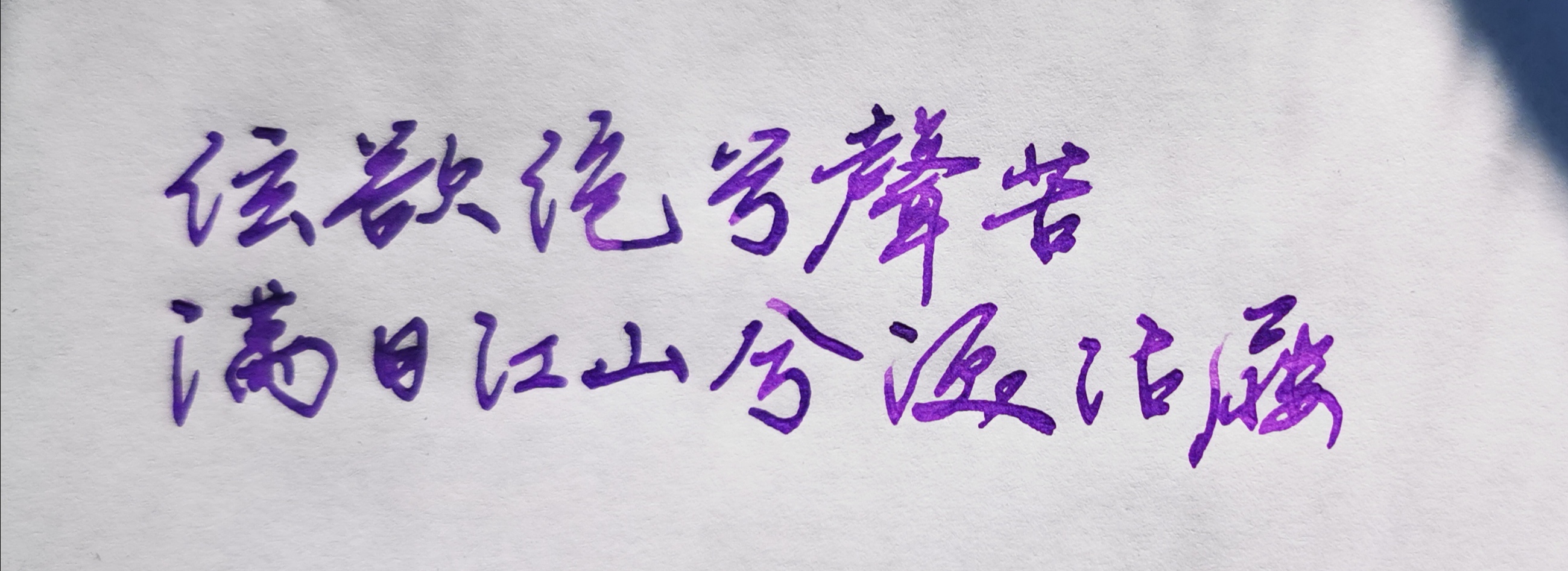 这一套里洛暮和妖姬是让我感到很迷惑的两个颜色,仔细对比后感觉妖姬偏紫一点,但几乎是看不出来的,不大面积涂的话两个颜色几乎一模一样。这个颜色是这一套里我比较喜欢的,正常书写时是藏蓝色,看起来很舒服,适合日用,稀释后是蓝紫色,有蓝色层析,非常漂亮。