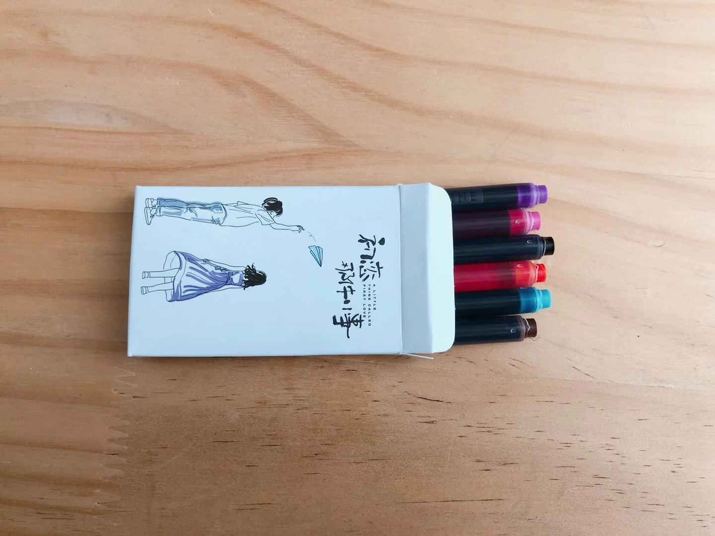 整个钢笔礼盒包含钢笔本体、一枚欧领的标准蓝色墨囊(放在钢笔里面)、一盒墨囊(六色)、一枚胸针还有一份说明书,其中最让我惊喜的不是胸针而是那盒彩墨。