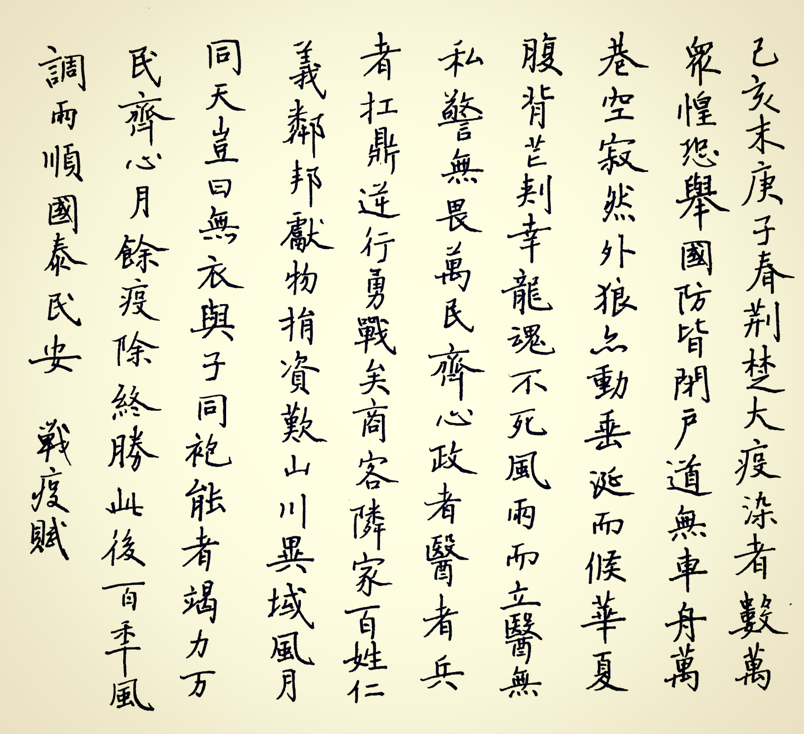 己亥末,庚子春, 荆楚大疫,染者数万, 众惶恐,举国防,皆闭户, 道无车舟,万巷空寂。 然外狼亦动,垂涎而候, 华夏腹背芒刺。 幸龙魂不死,风雨而立, 医无私,警无畏,万民齐心。 政者、医者、兵者,扛鼎逆行勇战矣, 商客邻家百姓仁义邻邦献物捐资, 叹山川异域,风月同天, 岂曰无衣,与子同裳。 能者竭力,万民同心! 月余 ,疫除,终胜。 此后百年 ,风调雨顺,国泰民安。